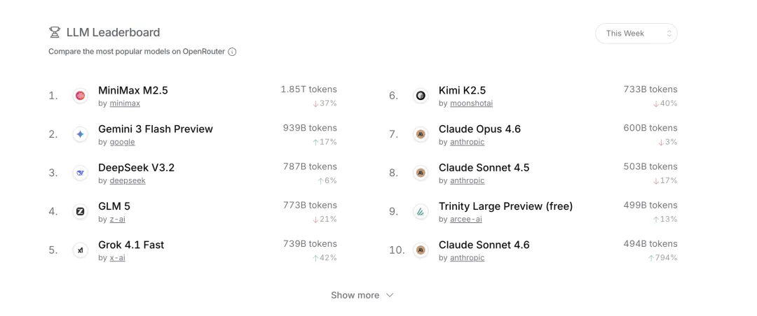2026 年 2 月 24 日,OpenRouter 发布了一份周度数据:平台前十模型的总 Token 消耗约 8.7 万亿,中国模型独占 5.3 万亿,占比 61%。MiniMax M2.5 以 2.45 万亿 Token 空降榜首,Kimi K2.5、智谱 GLM-5 紧随其后,前三名清一色来自中国。