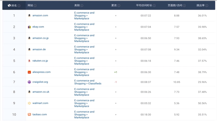 2)我们再看看在全球电商排行榜中亚马逊其他站点的表现: