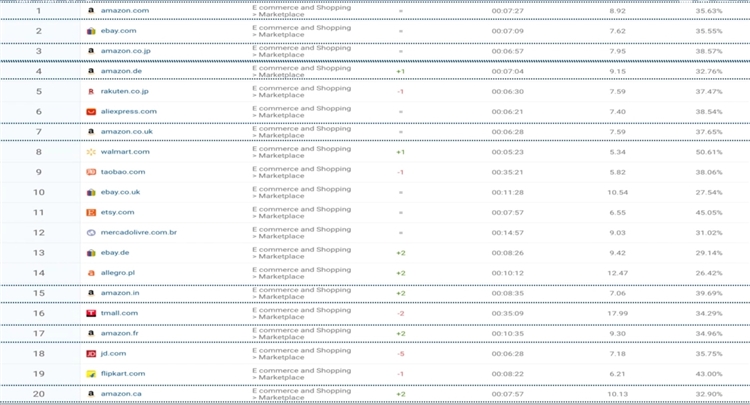 我们可以看到亚马逊有7个站点排在全球电商top20。在top22中,亚马逊占据9席。也就是说,全球差不多有一半的销售额都是亚马逊这个超级市场产生的。