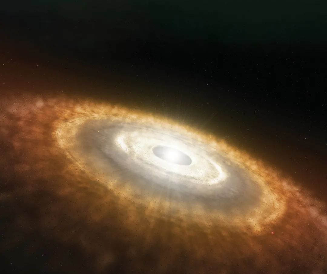 这张艺术创作中,年轻的恒星周围带有一个由气体和尘埃组成的原行星盘,行星正孕育其中。