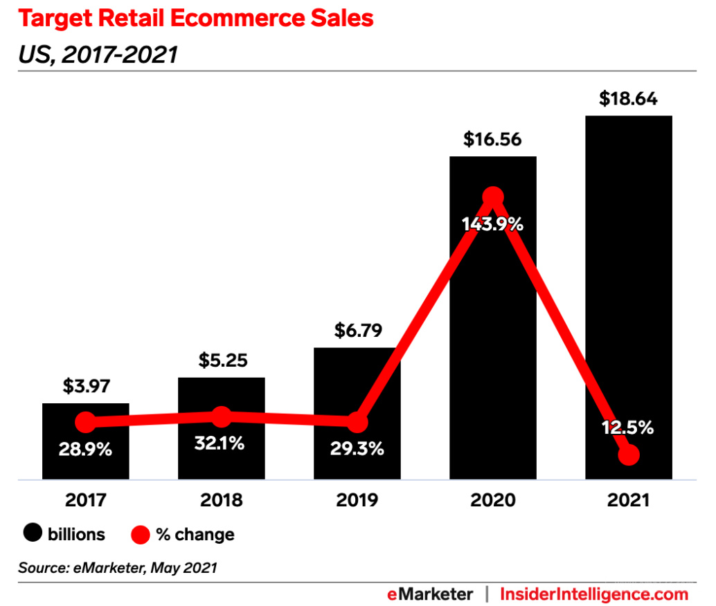 AMZ123获悉,自2019年以来,Target的线上销售额猛增近175%。eMarketer预测今年Target在美国的电商销售额将突破 180 亿美元,这几乎相当于其 2016 年至 2019 年在美国的电商销售额总和。