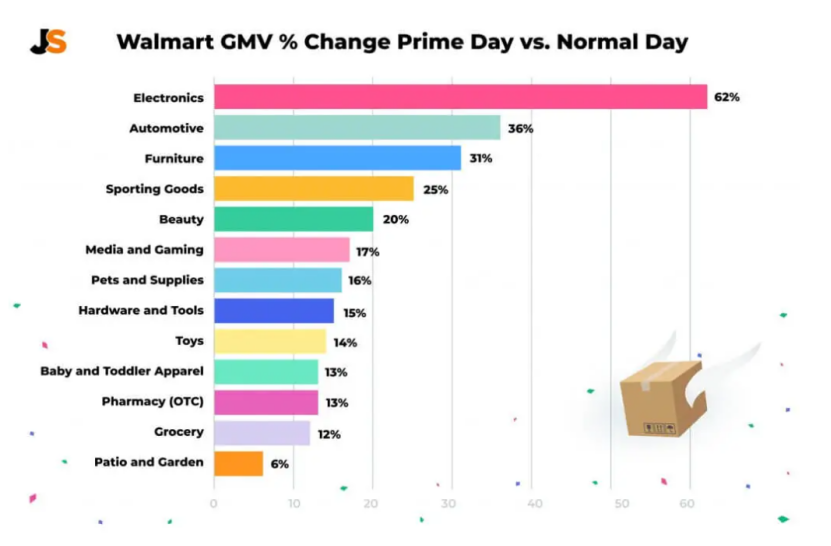 2021年Walmart.com在Prime Day期间热销品类的GMV表现: