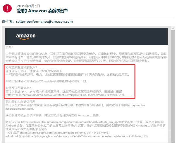 如下图所示,亚马逊可能会要求卖家提供额外的证明材料来佐证注册时提供的信息。此类通知通常seller-performance@amazon.com邮箱发出,但不同的站点间可能有所差异(例如,日本站点的通知可能是通过alliance@amozon.co.ip发出)。请严格遵照业绩通知中所列出的要求准备相应的材料。