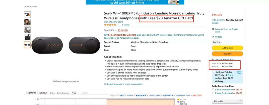仔细研究了一下这个产品,其实和泽宝的这个索评卡套路不太一样,自营的耳机实际上是和一个亚马逊礼品卡产品用"虚拟捆绑"功能绑定在了一起,这样实际上消费者相当于是一次下单购买了2件产品。但是因为只用付耳机的钱,也就相当于做了个20美金的折扣活动。