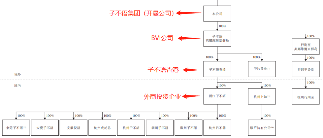 可以看到,子不语搭建了经典的红筹架构,实控人华丙如、余风夫妇和其他个人股东设立了N家BVI公司,投资开曼公司(上市主体),开曼公司通过下设BVI公司间接控股香港公司(中间设一层BVI公司一般主要考虑到后期转让和处置的灵活性),然后再通过香港SPV返程投资境内拟上市资产浙江子不语。