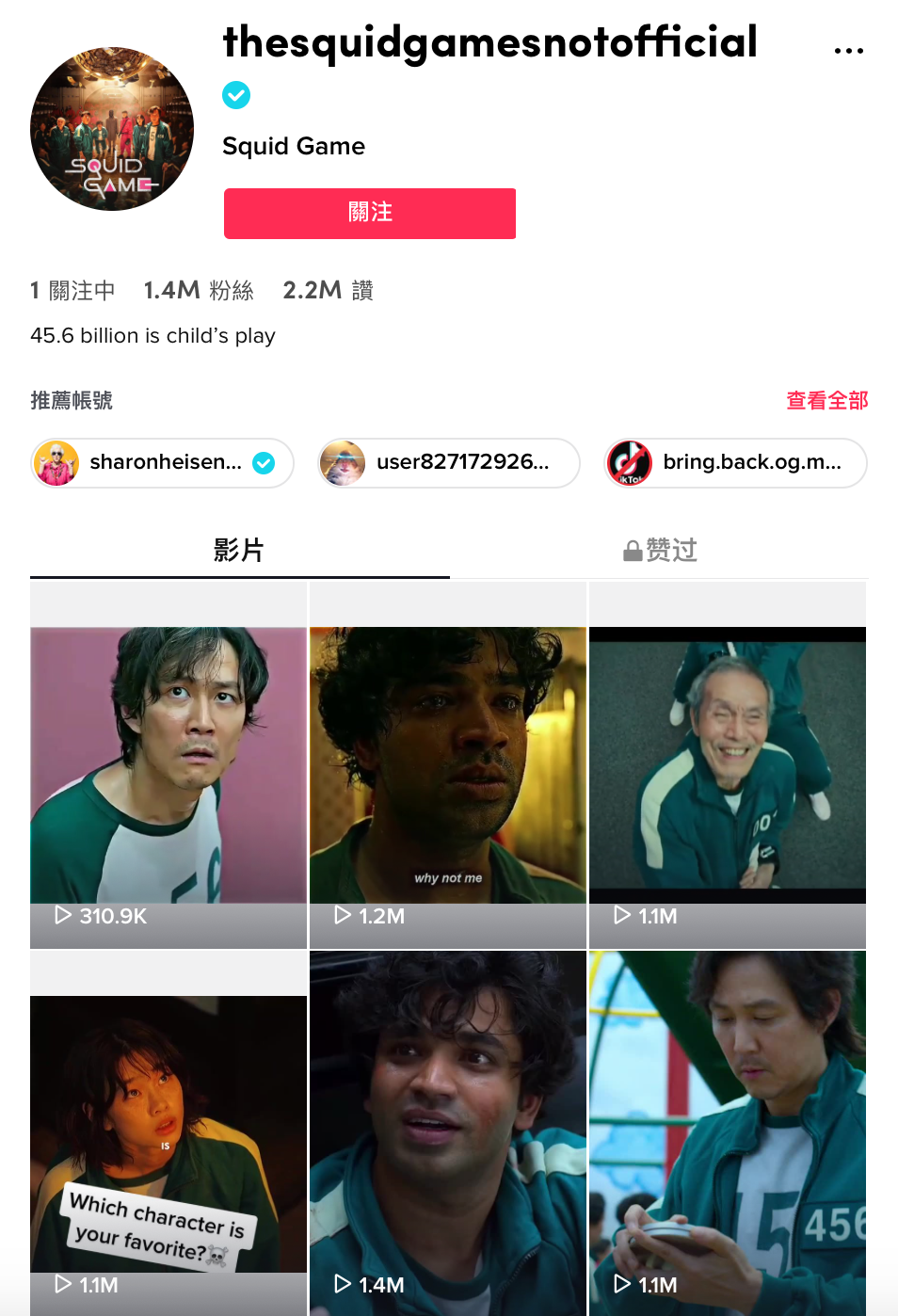 TikTok上,鱿鱼游戏的官方账号短短几天就有了140万粉丝,发布的视频大部分都是百万以上播放量。