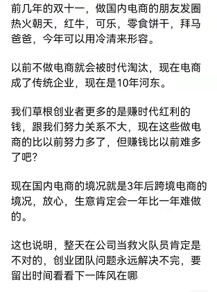 今天想思考一个问题,跨境电商下一个风口在哪?为什么想思考这个问题呢?因为昨天看到了DX的朋友圈的一段话,让我最直观的思考就是,那么下一个风口,应该在哪呢?原文如下:最后一句话,整天在公司当救火队员肯定是不对的,创业公司的问题永远解决不完,要留出时间看看下一阵风在哪那么问题来了,下一阵风在哪?如何找到下一阵风?首先,对于我自己来说,就和我自己坚定的那样,未来的至少5-10年内,都会在跨境电商行业深耕