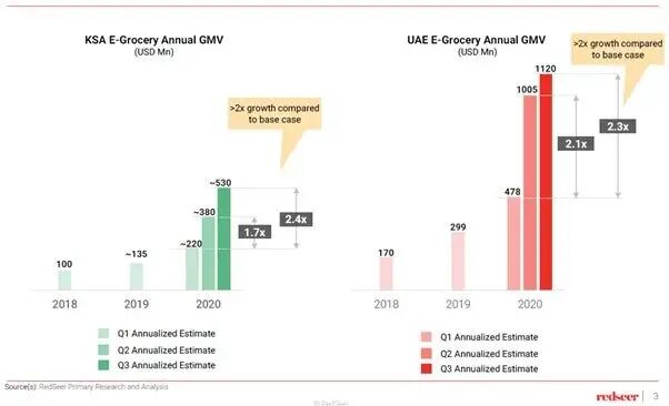 另一家咨询公司 RedSeer Consulting 观察到,杂货电商是该地区增长最快的电子商务领域,疫情初期的增长在沙特和阿联酋尤为明显。