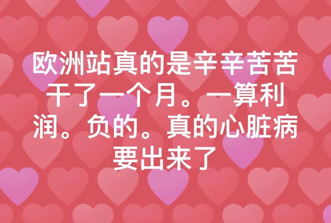 汇率持续下降太影响利润了。有粉丝给我们分享了一个社交媒体上的帖子,"欧洲站真的是辛辛苦苦干了一个月。一算利润。负的。真的心脏病要出来了"。看了,实在让人心酸。