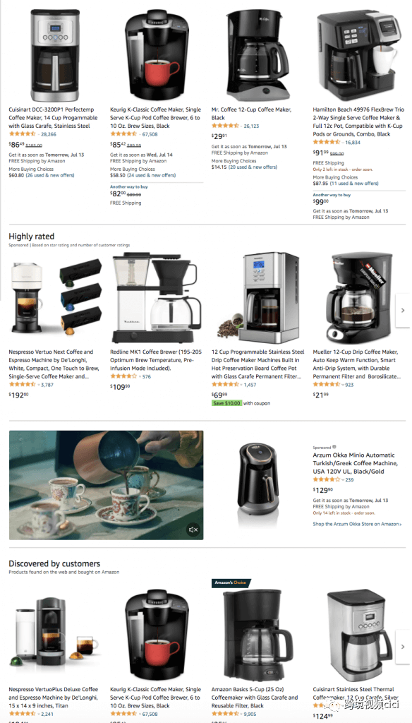 在本例中,我们要销售单杯咖啡机。首先,让我们搜索广义术语"咖啡机",看看会出现什么。