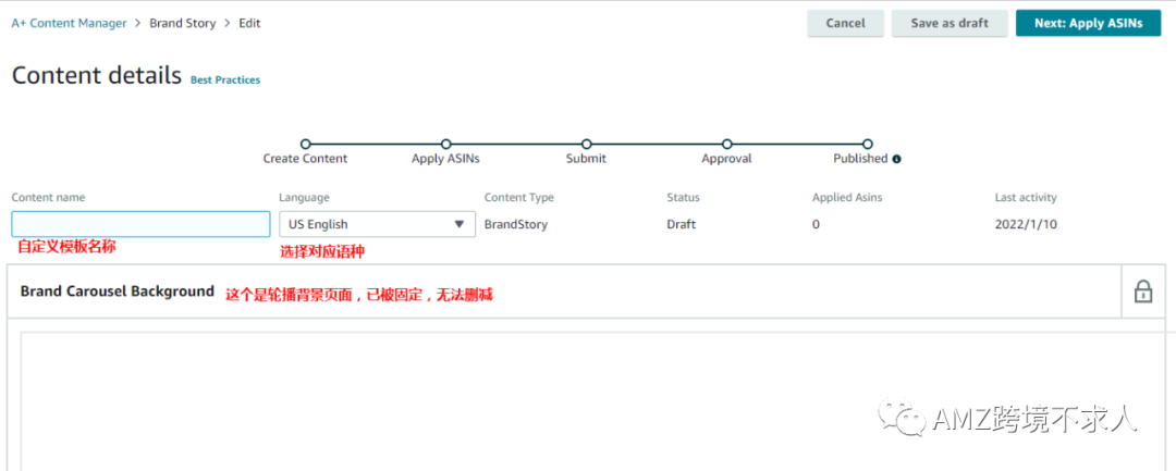 1. 功能路径入口:Advertising---A+ content manager---Start creating A+ content --- Creat brand story,页面如下: