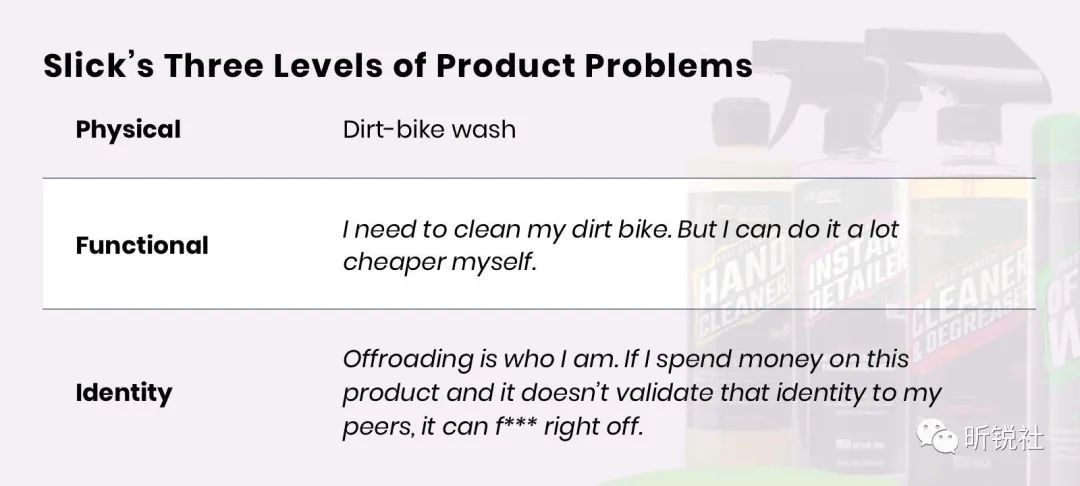 例如,品牌Slick Products给越野车销售清洁剂。最初,Slick 的主要竞争对手并不是其他的越野车清洁剂。越野车爱好者自制且非常便宜的清洁混合物,这就需要验证花钱购买特殊清洁剂的想法。这意味着让这个紧密结合、高度独立的社区知道产品适合他们的生活方式。