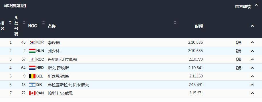 第一组比赛一共有7名选手,刘少林出场后位居第一,加拿大的戴恩在第一,随后韩国选手李俊瑞完成超越开始领滑,最终李俊瑞第一位到达,冲线成绩是2分10秒586,匈牙利选手刘少林2分10秒685第二.............