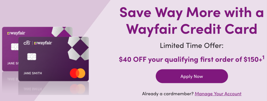 从现在起至1月31日,使用Wayfair万事达联名卡或者Wayfair信用卡,符合条件的第一笔订单满150美元可以立减40美元。
