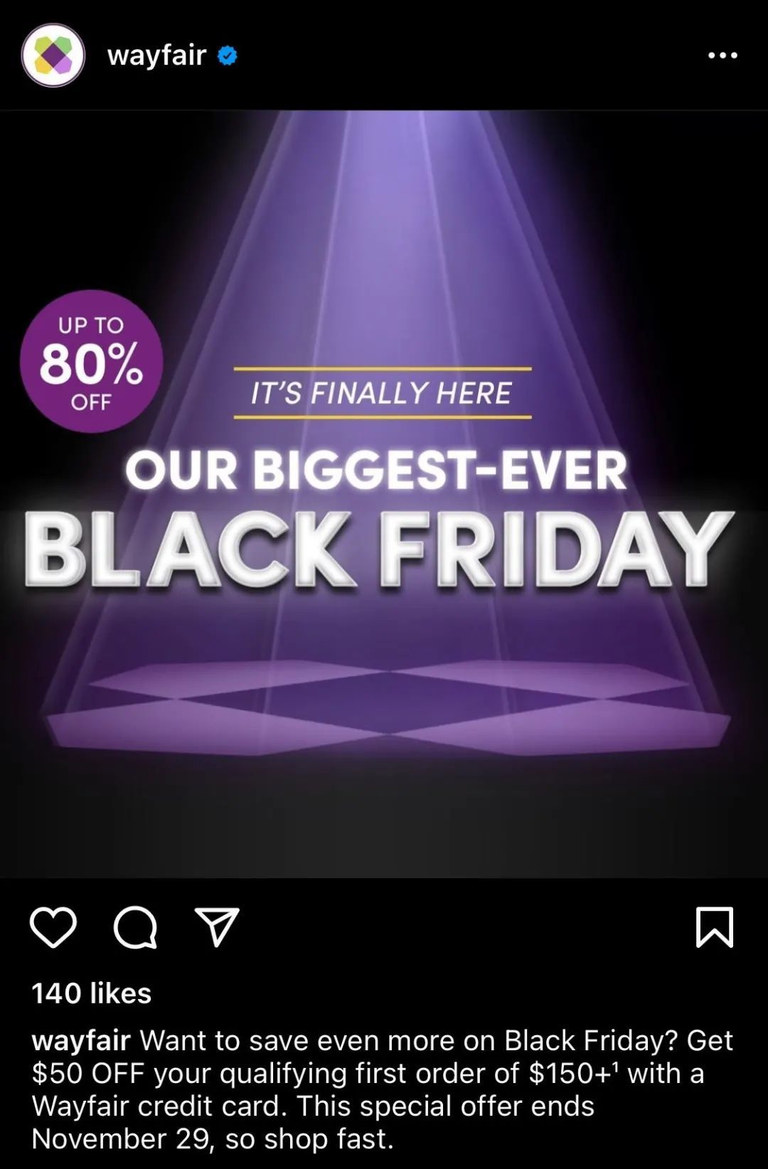这种吸引用户的玩法立竿见影。去年的黑五网一大促,Wayfair更下血本。对于合乎规定的首个订单,只要使用Wayfair信用卡,且金额高于150美金,可以享受50刀优惠!