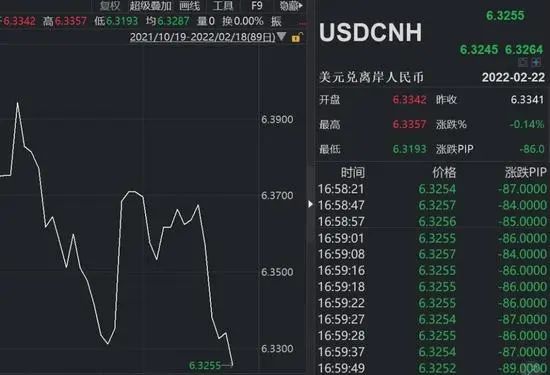2月18日16时起,境外离岸人民币兑美元汇率突然大幅上涨约200个基点,一度突破6.3200关口,触及近4年新高6.3144,创下2018年5月以来最高点。受此影响,境内在岸人民币兑美元汇率跟进上涨,一度刷新1月28日以来最高值6.3253。