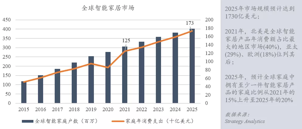 智能家居全球市场规模预计在 2025 年达到 1730 亿美元,其中北美地区占比最大(40%)。监控摄像头则是最受欢迎、最刚需的智能家居设备之一,2020 年调查统计约有 30% 的智能住宅装配有智能摄像头。