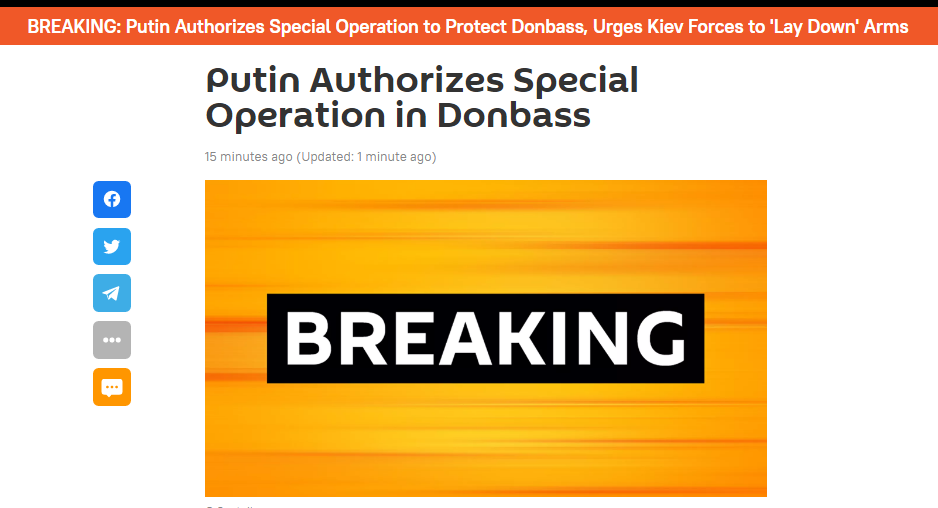 俄卫星社刚刚消息,俄罗斯总统普京在对俄罗斯民众发表的特别讲话中宣布,他决定在顿巴斯地区开展特别军事行动。