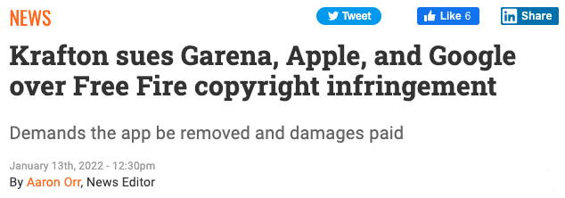 据媒体1月13日报道,《绝地求生》游戏开发商Krafton将苹果、谷歌和游戏公司Garena告上法庭。此外,YouTube也遭到点名,原因是其平台上存在大量涉嫌侵权的游戏视频。