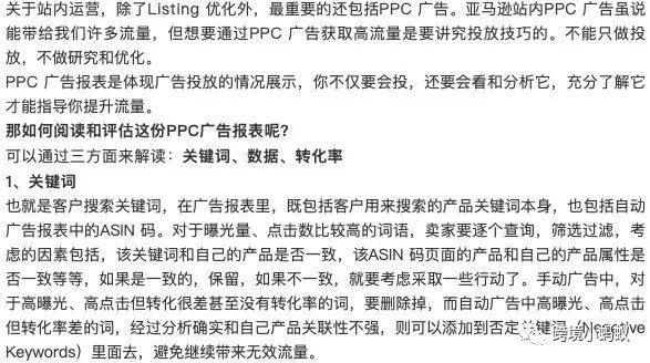 是指数量,广告开始投放后,卖家一定要关注两个数量:曝光量和点击量。如果曝光量很低,要么是词太偏了,要么是出价偏低了,偶尔也可能是产品详情的内容填写偏了。对于曝光量低的关键词,可以尝试提升单次点击价格,随着价格的提升,曝光量增加,此时,要看点击量,点击量太少,数据基数就小,数据基数小就没有办法论证广告投放的有效性,所以,从广告报表中,要看曝光数量和点击数量的多少,尽量先让数据变大。