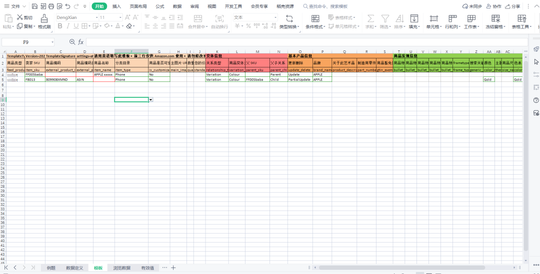 1) 第1行填父体信息,要填一个新的SKU , 商品名称,品牌,其他可参考表