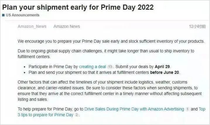 亚马逊美国站发布公告称,由于持续存在的全球供应链挑战,将库存运送到运营中心的时间可能会有所增加。因此,亚马逊建议卖家尽早为Prime Day促销活动做准备,为产品储备充足的库存。以下是参加美国站Prime Day两个重要的时间节点:
