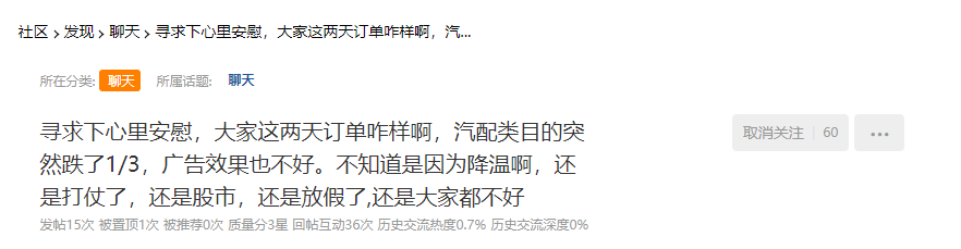 一卖家发帖哭诉,称上个月20号以后自己店铺的广告ACOS从25%涨到55%,广告出单减少了一半。而这两天汽配类目的订单更是突然下跌了1/3,整体来说和去年也完全没法比。