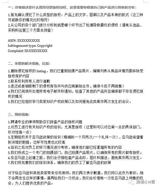 3. 说明补救措施:比如使用批量模版删除侵权词,移除库存不再销售,比如对有疑问的客户退款等等
