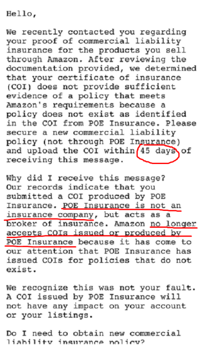 亚马逊审查了卖家向亚马逊提供的亚马逊销售的产品的商业责任保险证明,