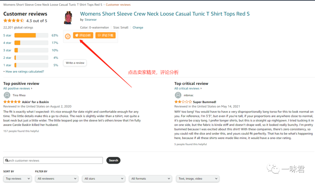 在评论里面,通过点击筛选功能找到rating最多的子体,然后在前台通过颜色和尺寸找到这个子体,再来深入研究这个子体。如果你觉得你的子体可以抢这个子体的流量,那么直接找到你即将要上架的类似子体开广告,其他子体不需要开广告。假如你觉得竞争对手的子体已经占据了很多流量入口,那么可以找竞争对手评论第2名或者第3名的子体出来。然后再找一条自己链接类似第2/3的子体来开广告。