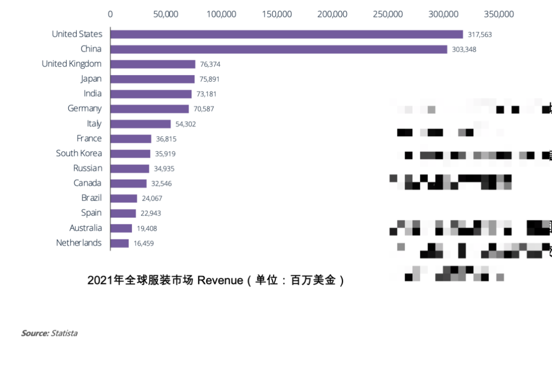 纵观全球,2021年,全球服装最大市场为美国和中国,英国、日本、印度和德国则随其后。其中美国和中国的市场规模更是达到了3千亿美元大关,遥遥领先其他国家和地区。