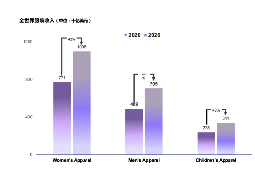 服装出海,关注完区域市场后,下一个是赛道。在三大服装品类中,女装市场份额依旧遥遥领先,预计以42%的复合率增长,到2026年,可达到万亿美元。当然,男装和童装的复合增长率也保持在40%左右。