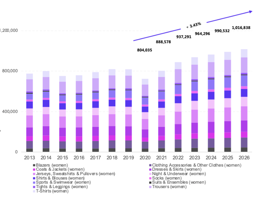 而这些背后,一方面,源于整个市场大势, 来自Statista的一份数据显示:"2021年,中国占据全球主要服装出口国43.5%的份额,而且这一份额有望增长";另一方面,服装更是一个天花板很高的品类,拿女装市场来说,预计有42%的复合率增长,到2026年,可达到万亿美元。