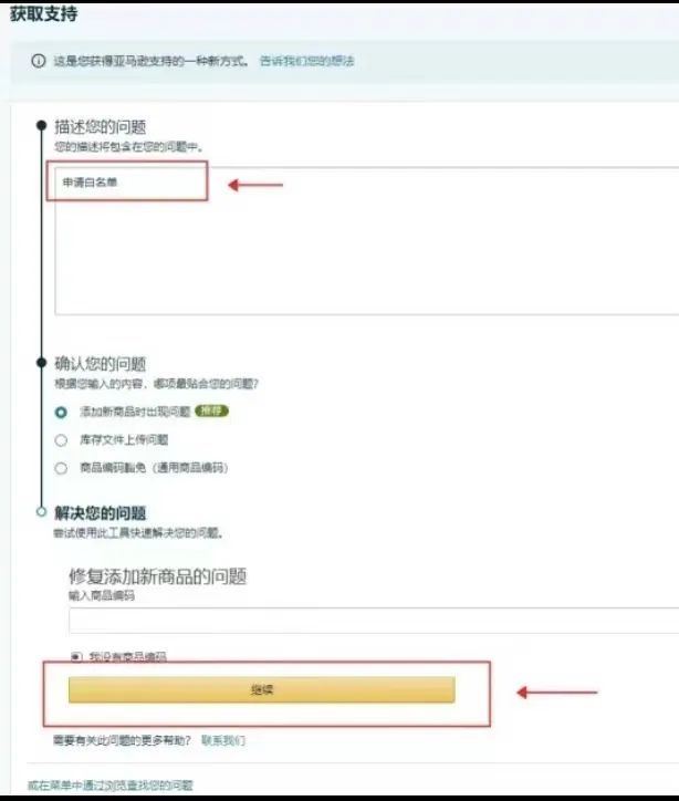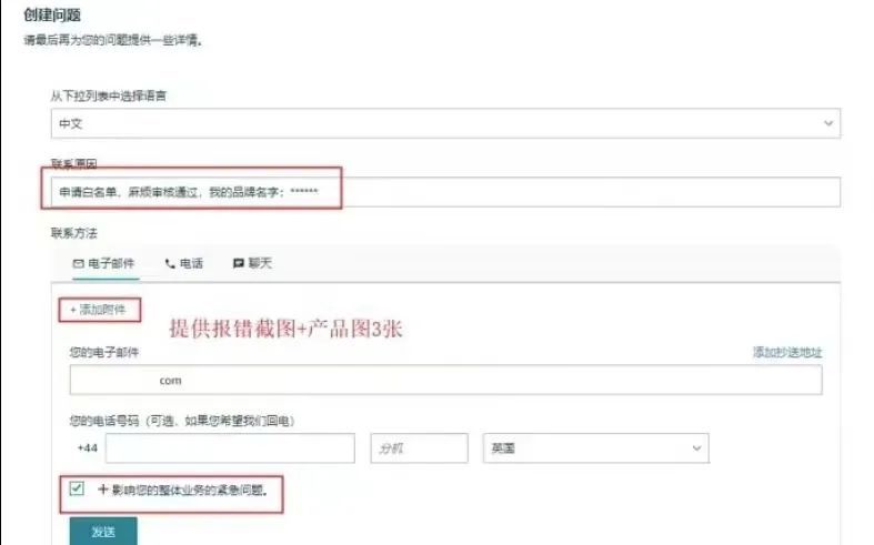 2.第二种情况:早期因为不知道产品是否好卖,为了省钱随便填写的品牌,现在无法修改后台参数了,因为会出现5665报错而导致修改参数后无法保存,这种的话,实际上也是跟第一种情况一样去处理,申请窗口可以有两个,一个是跟上面一样,在提出建议那个窗口进入申请,还有一个申请窗口如图所示,也是可以的。可以同时两种都进行,这样子时效会更快一些。(可以收藏,毕竟找服务商需要300-400块,时效1-4天,而自己按照我讲的方法实操,不到半个小时就解决了。)