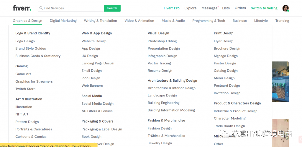 以Fiverr为例,Fiverr的导航栏很直观的展示了大分类和下面细分类,用户需求什么,顺着分类指引点击寻找即可,比如这个"Graphics & Design"是最大的分类,在其之下"logo& Brand Identity"、"Gaming"、"Art&IIIustration"等等就是他的二级分类,而在二级分类之下还有更加细化的三级分类。
