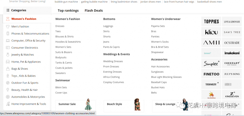 再举个电商卖货的例子。速卖通Aliexpress,在首页侧边就有比较详细的产品分类,比如一级类目是"Women's Fashion",他的二级类目里面有"Swimwear"等等,在这之下的三级类目也就是我们可以考虑的Niche选择;