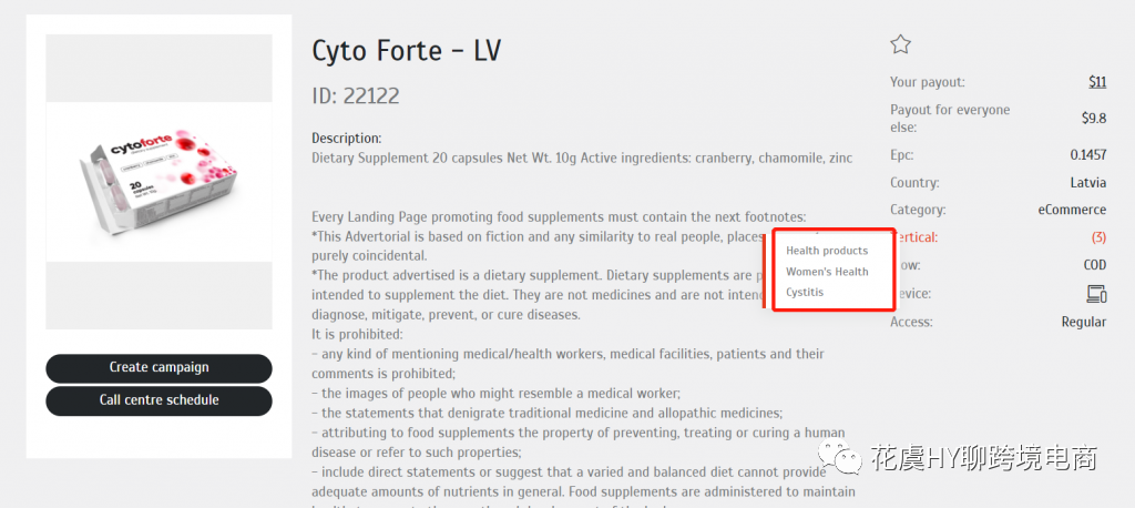举个例子,在我们跑offer的时候,比如这个产品,针对女性健康的,可以看到他给了三个关键词:"Health Products"、"Women's Health"、"Cystitis泌尿系统",
