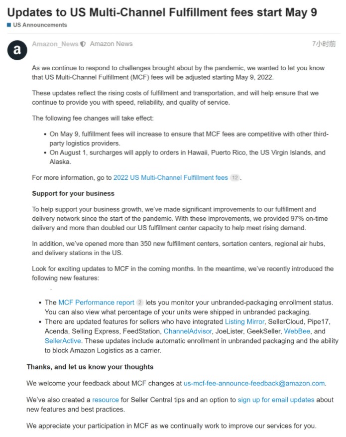 1.亚马逊将于5月9日上调多渠道配送费用;