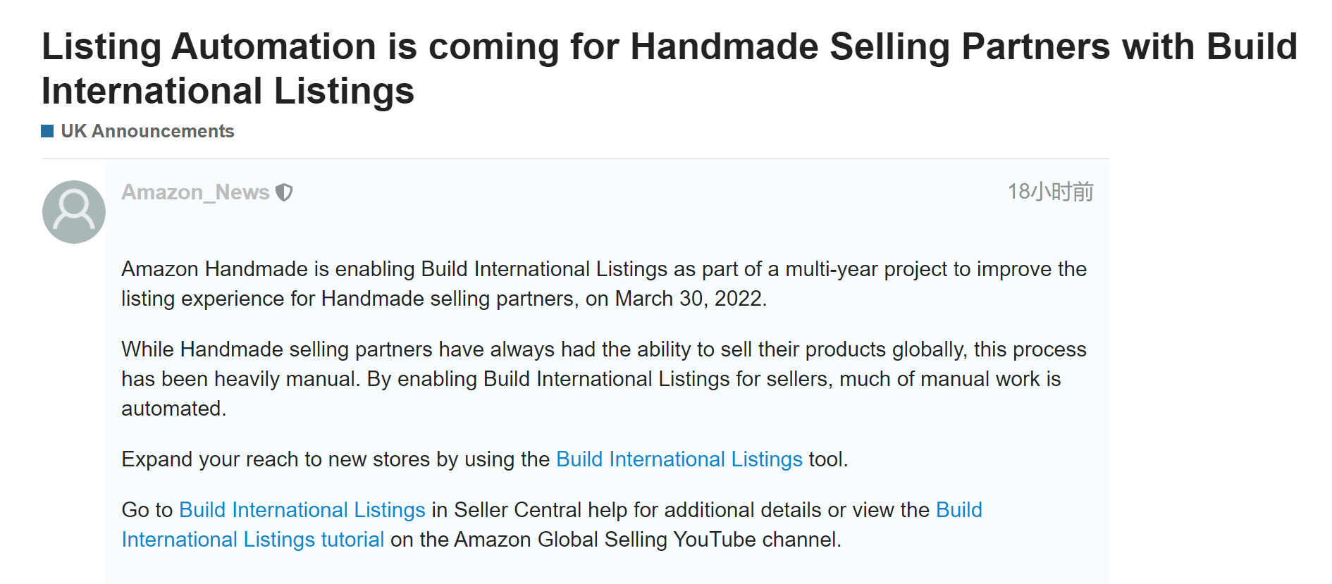 亚马逊美国站和欧洲站发布公告称,Amazon Handmade将于2022年3月30日启用"Build International Listings",通过为手工卖家启用建立国际商品信息为亚马逊手工卖家提供产品上架自动化功能,将大部分产品上架手动工作转化为自动化上架,简化卖家的产品上架程序和缩短上架操作时间。这是一项旨在改善亚马逊手工卖家销售体验的多年项目的一部分。卖家可在卖家中心帮助中了解更多"Build International Listings"的详细信息,也可以在亚马逊全球开店YouTube频道上查看"建立国际商品信息教程"。