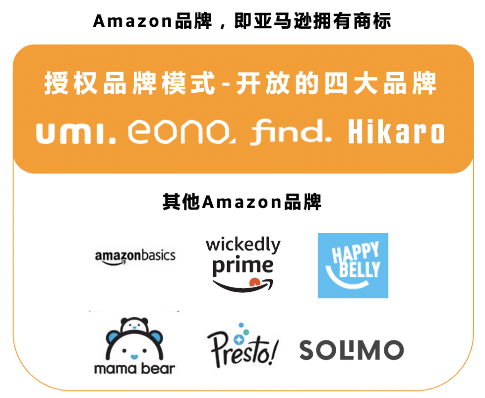 亚马逊拥有并提供品牌,目前授权品牌模式开放的四大品牌Umi、Eono、Hikaro和Find已上线3,000多种产品,品类繁多,包括消费电子、运动、家居、家具、办公、园艺、服饰、箱包、手表、珠宝、美容美妆、个护健康、宠物用品和食品、母婴用品(非服饰)等