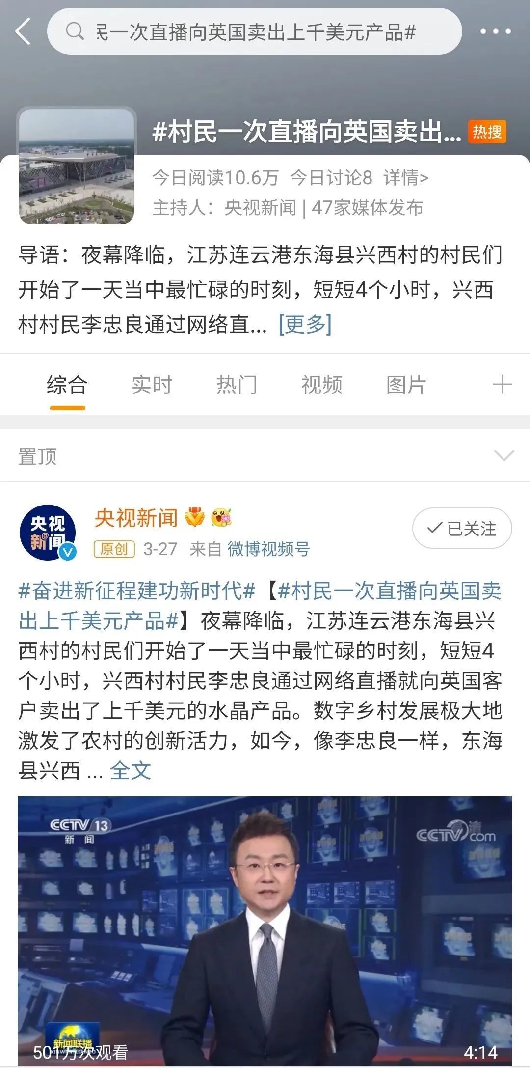 在新闻联播采访中,东海县兴西村党总支书记赵中刚说:"以前在我们村子里,晚上不到8点钟就是黑漆漆的一片,这两年随着跨境直播电商的兴起,凌晨三四点我们村子里依然是灯火通明。"