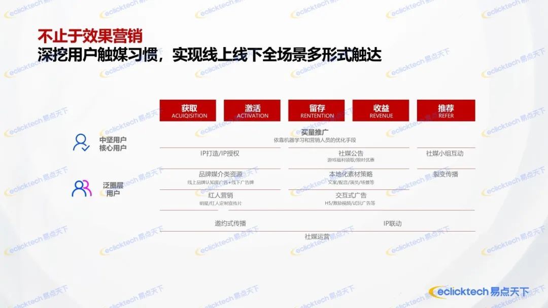 在用户增长的各个阶段中,企业坚持在买量推广上进行机器学习和人为优化以外,都展开了多种营销手段,比如在获客,激活期打造自有IP,从而收获核心粉丝;通过红人营销增强对泛圈层用户的覆盖;亦或是在产品侧通过邀约式设计达到冷启动的目的;并且在处于提升留存和增加收益的阶段,大部分企业都进行了本地化素材内容的制作和交互性创意的使用,同时通过IP联动来拉升品牌的好感度和信任度。