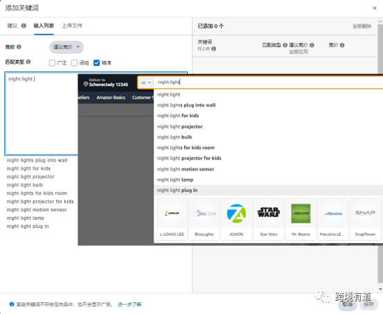这个地方的选词位置相信只要是个开过广告的亚马逊卖家也就不会陌生了,就在"广告"-"广告组"-"添加关键词"中,一般都会有具体的关键词进行推荐,推荐出来的关键词跟亚马逊前台搜索框下拉关键词是完全一致的,并且可以一键添加,过程省时省力,如图所示: