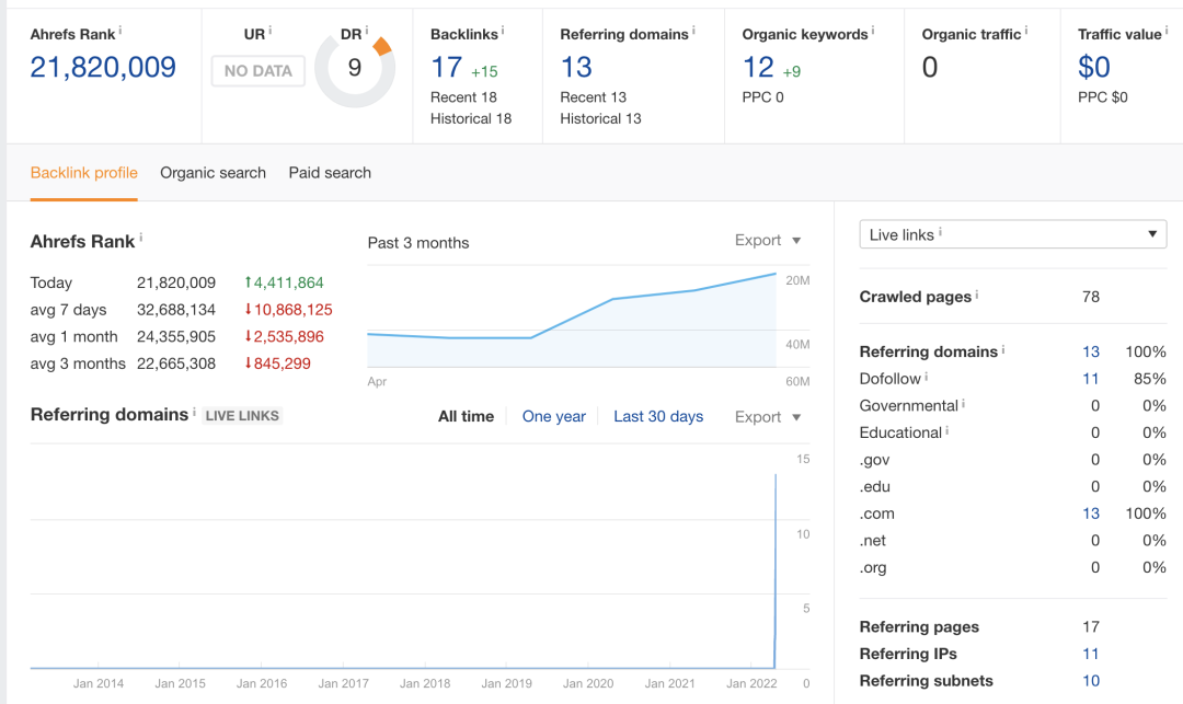 前两天的数据是DR 9, Backlink 17, Organic Keywords是12