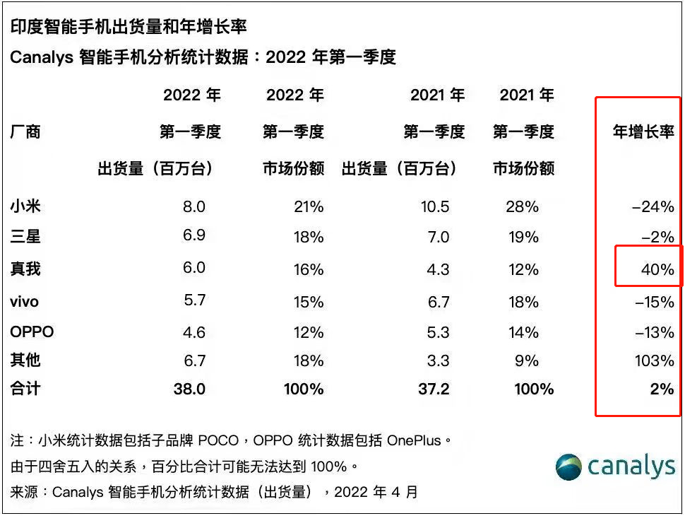 根据市场调研机构 Counterpoint的数据,截至21年11月,全球前TOP10品牌中,中国品牌占据了8家。其中,一个名不见经传的年轻品牌——realme,吸引了品牌方舟的注意。 仅三年时间,realme在全球销售累计超1亿部,而苹果为实现这个数字花了44个月,华为花了62个月,三星则用了73个月。 这是全球智能手机发展史上前所未有的速度,刷新了行业纪录,也刷新了"中国速度"。 根据Canalys公布的印度智能手机出货量和年增长率数据报告,可以清楚地看到2022年第一季度各大国产品牌所取得的成绩。