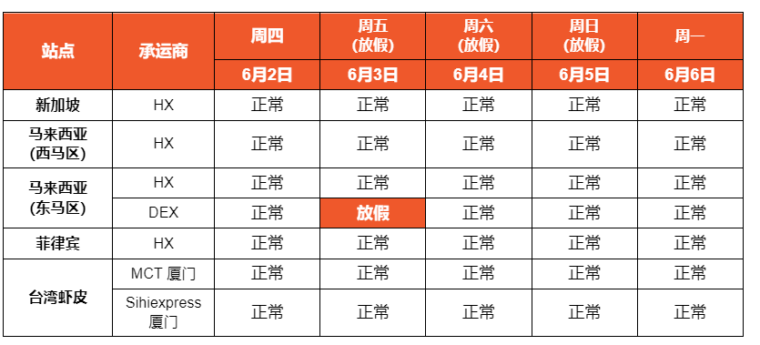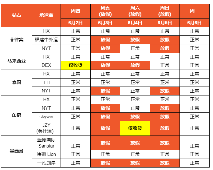 香港仓:6月3日,6月5日(周日休息)放假,仓库不操作、不收货