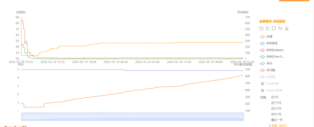 产品的上架时间是2021-12-22,所以产品之前就应该运营过,虽然目前曲线显示只有24天的运营时间,那么考虑翻新或者跟卖