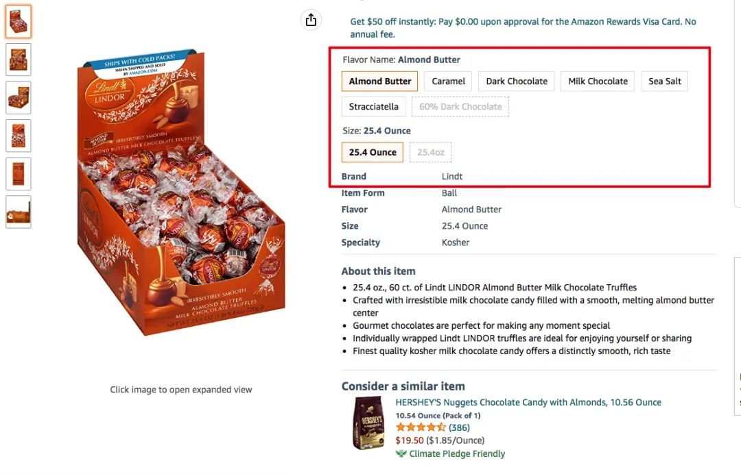 如果你在食品类目 我不建议你拆分,就算你的每个变体已经有稳定的销量,因为一旦拆分会影响消费者体验,有时候可能找不到你的变体,本来是我想购买carmel 但是我通过 almond 口味找到这个链接 但是页面并没有找到我要的口味,可能我会购买其他品牌,因此这种按照口味分类的食品多变体链接我不建议进行拆分。