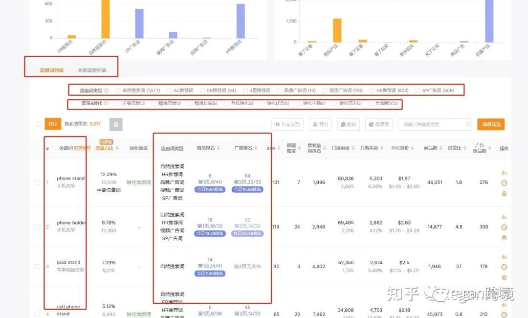 这里的流量分析和出单词反查都属于反查关键词的范畴,流量分析类似于关键词反查的2.0版本。能够更具体的看到这个关键词为竞品带来了多少的流量并且还有准确的关键词排名的信息。