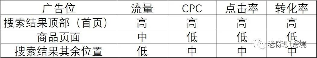 亚马逊的广告位分为三个位置,分别是搜索结果顶部(首页)、商品页面、搜索结果的其余位置。这三个位置各具特色,我做了一个表格,方便大家判断它们的区别。